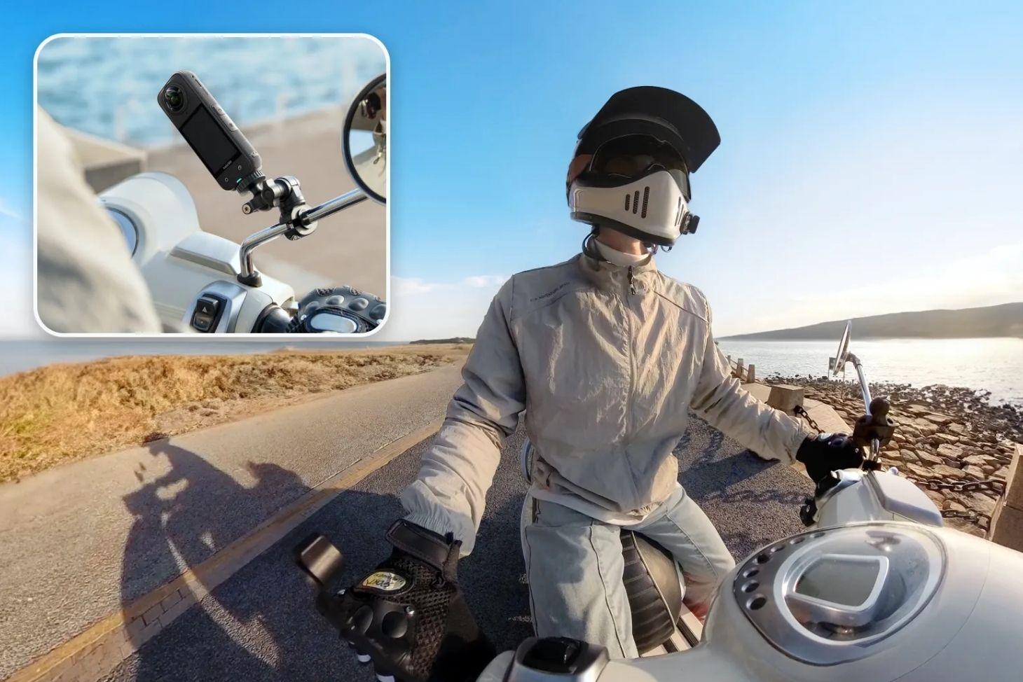 The Insta360 Rear View Mirror Mount is a lightweight, road-ready solution for expanding your shooting possibilities. Built from durable stainless steel and reinforced plastic, it holds firm through daily rides and long tours alike.